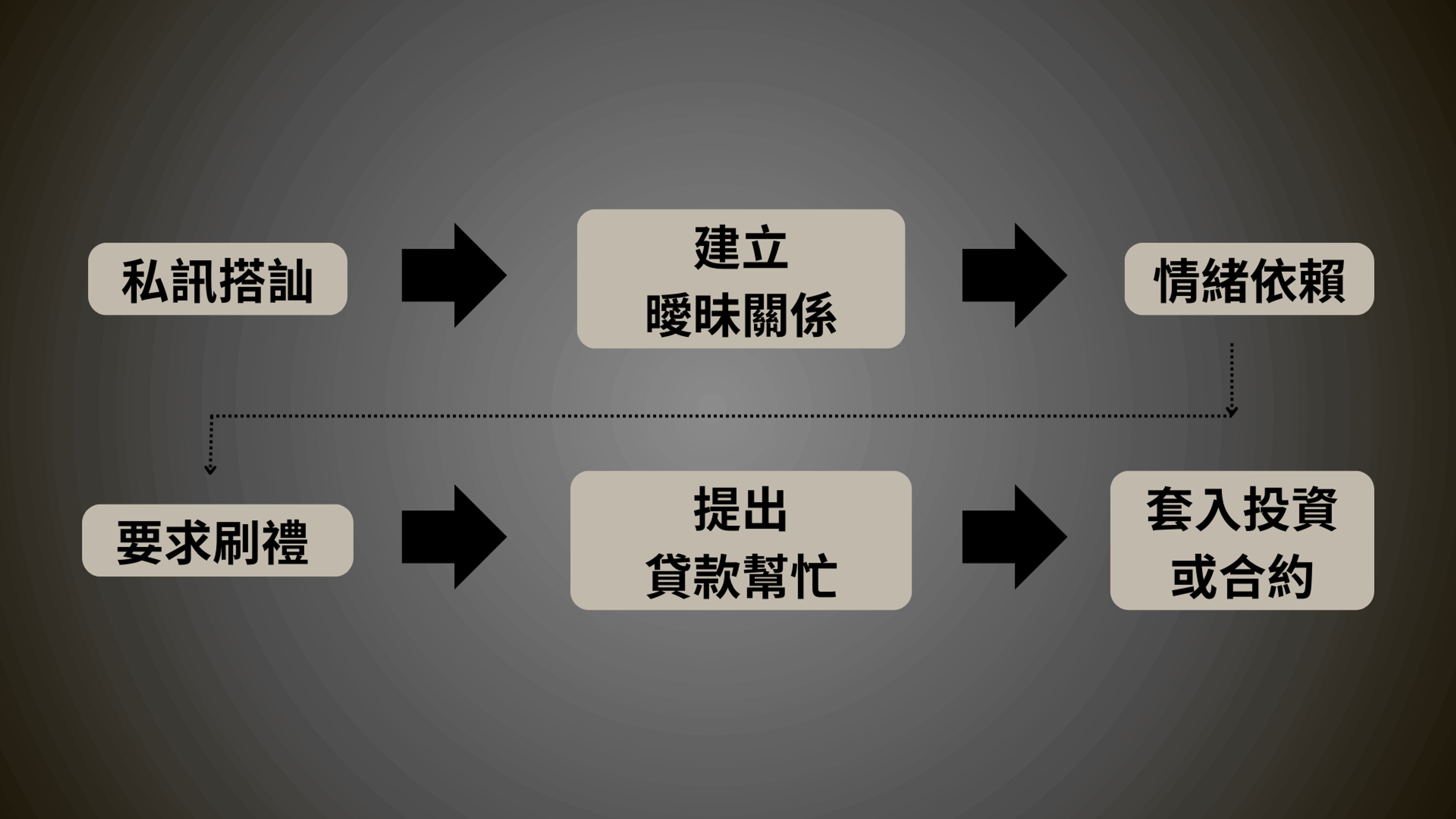 「私訊搭訕 → 建立曖昧關係 → 情緒依賴 → 要求刷禮 → 提出貸款幫忙 → 套入投資或合約」